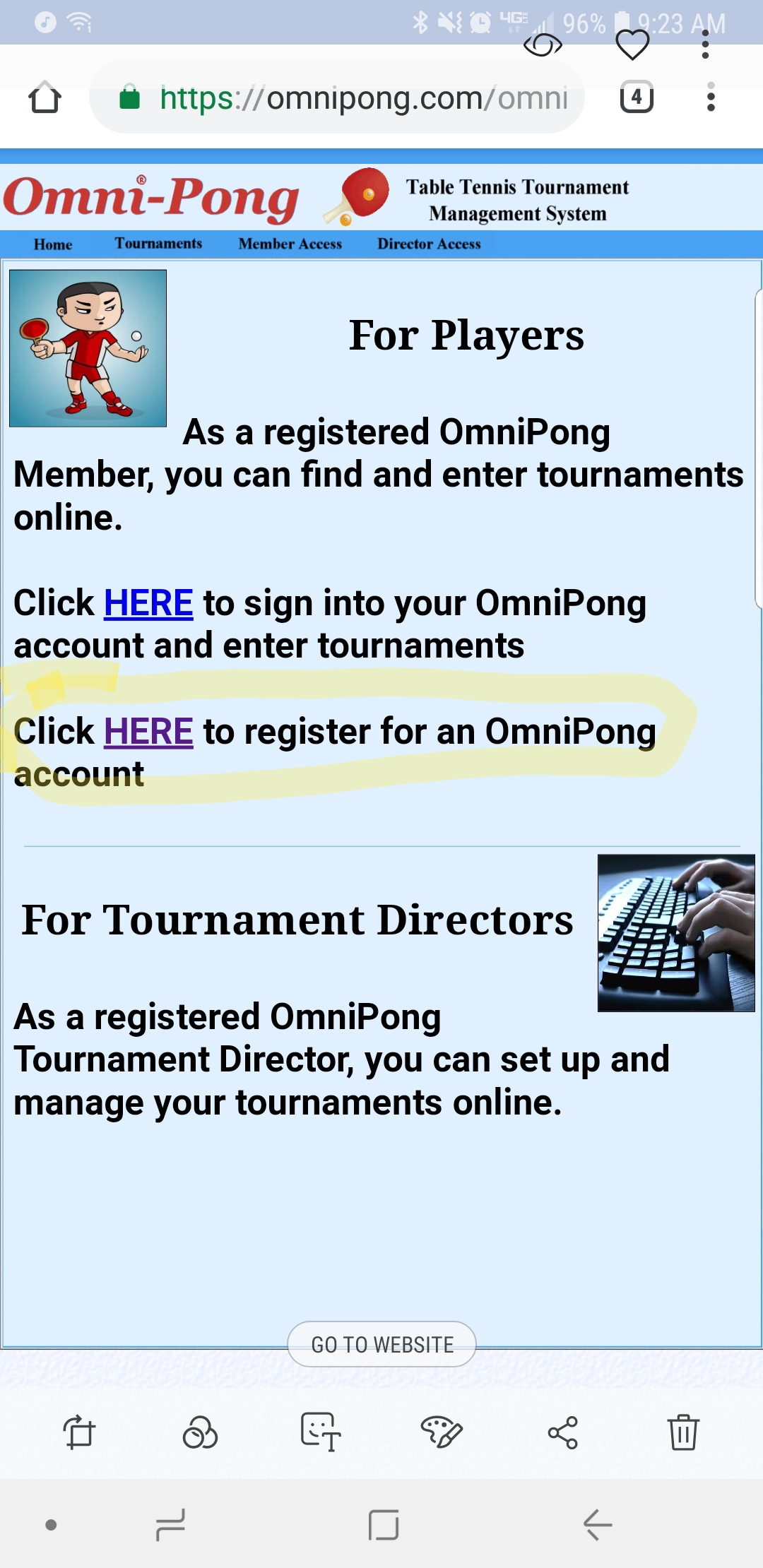 On the homepage www.omnipong.com click the highlighted link to register.