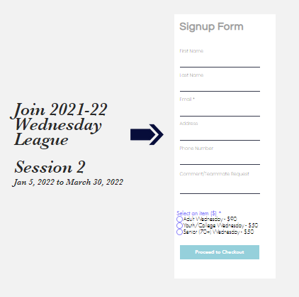 Registration is now open for the Wednesday League on our website.Wednesday League | Gvttc . Registration is open until Dec 31st. It will then close so teams can be created and league play starts on January 5th and runs until March 30th.