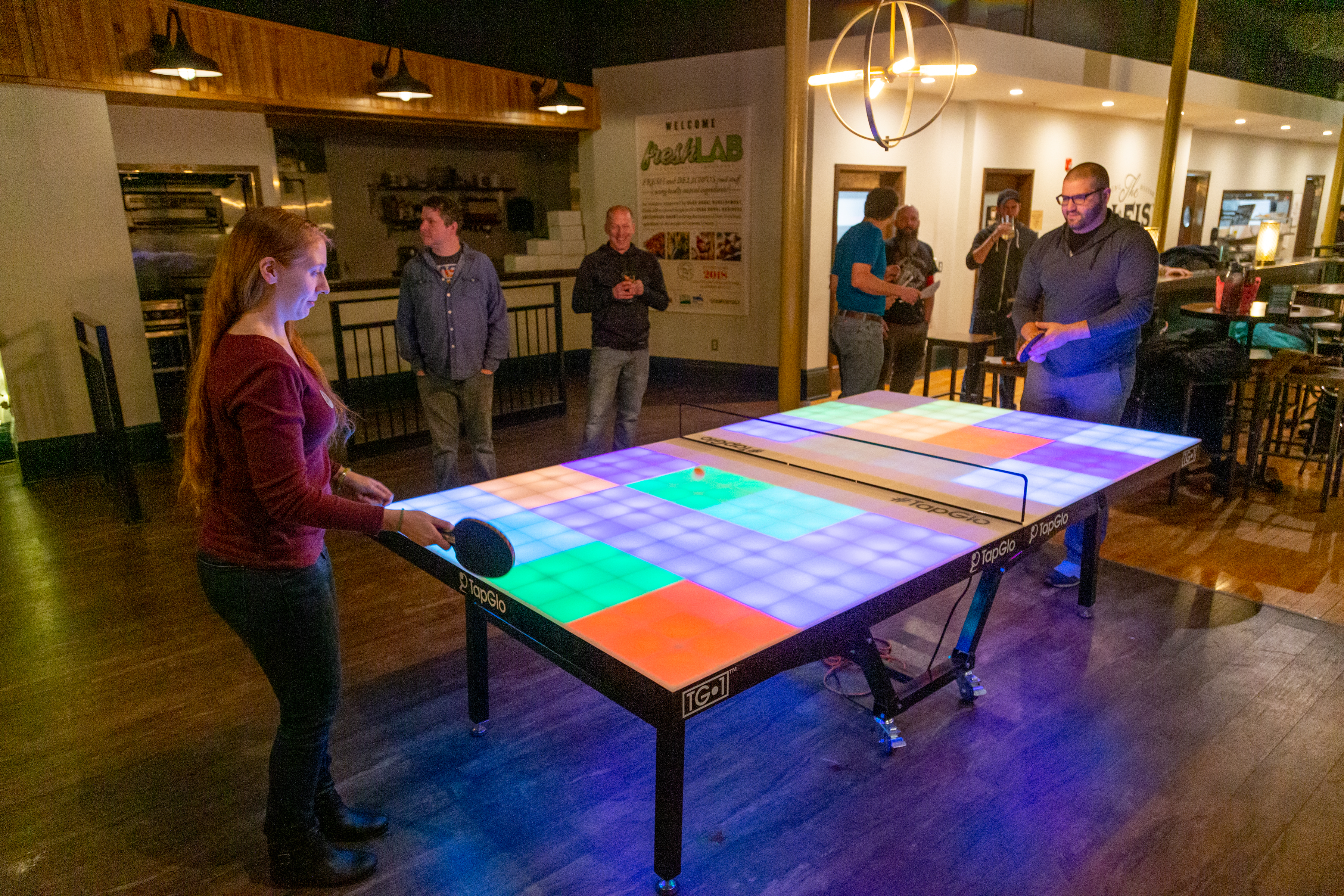 "TapGlo is an all-new way to play ping pong! We've put a spin on the traditional game to help bring the sport into the 21st century. With two signature game modes, Blackout and Stripes, the goal is to either blackout your opponent's squares or get all the stripes on your side of the table. If you thought you were good at ping pong, test your skills with this new table that will be available to play Saturday!”